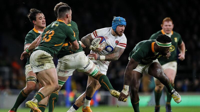 TACKLE: England's Jack Nowell is trapped by South Africa trio Franco Mostert (left), Jesse Kriel and Siya Kolisi (right) at Twickenham