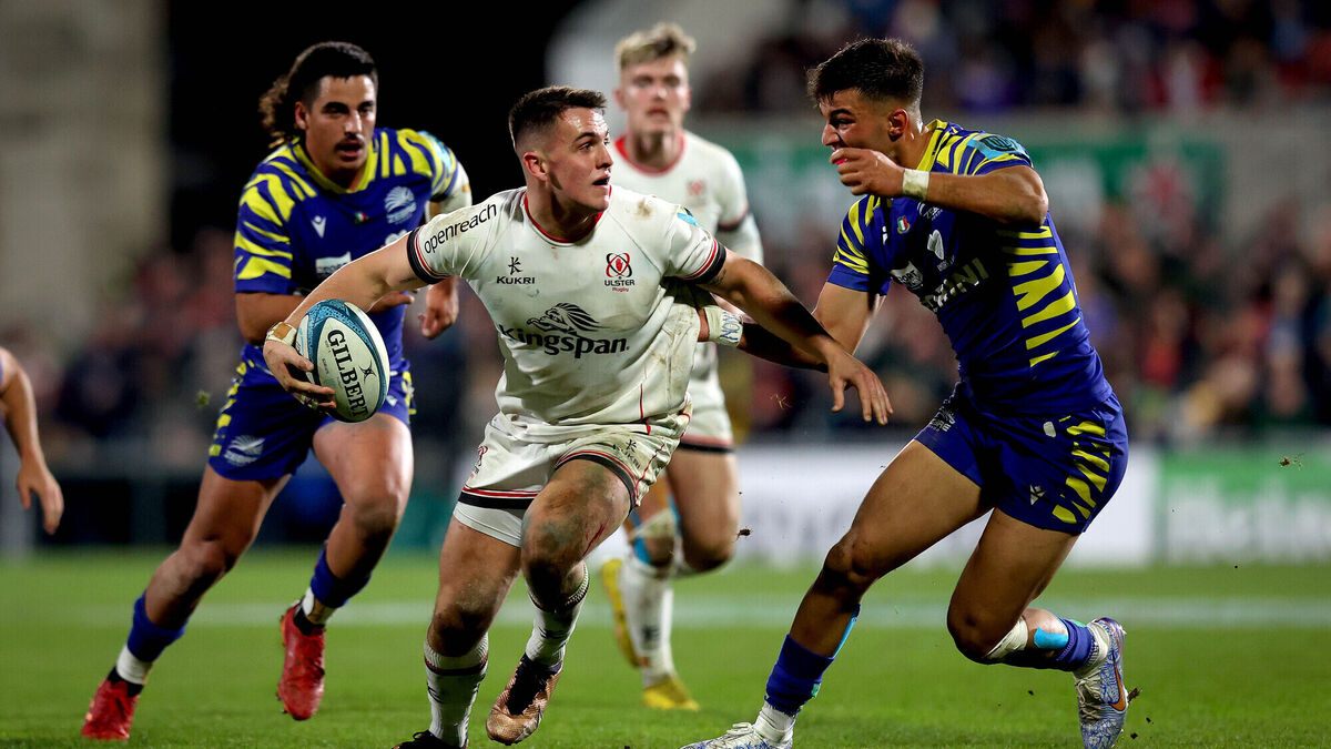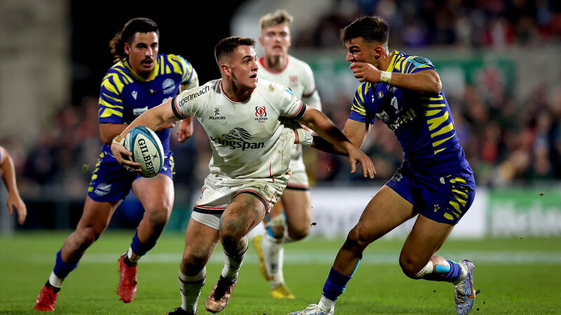 FRUSTRATING TIME: Ulster’s James Hume and Lorenzo Pani of Zebre Parma. Pic: INPHO/Ryan Byrne