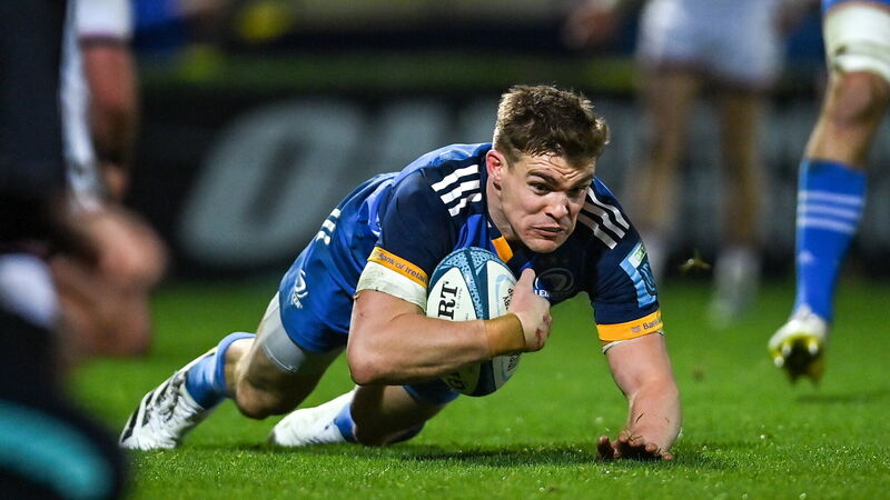 LEADING FROM THE FRONT: Garry Ringrose of Leinster dives over to score his side's third try during the United Rugby Championship match between Leinster and Ulster at the RDS. Pic: Ramsey Cardy/Sportsfile