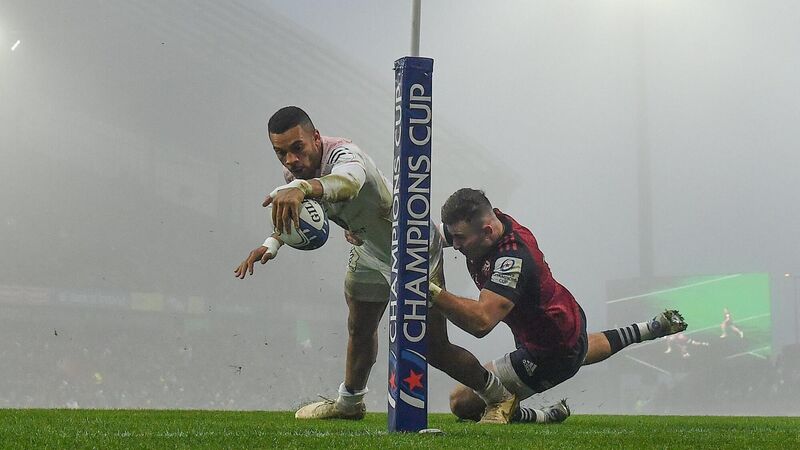 SETTLER: Matthis Lebel of Toulouse scores his side's first try despite the tackle of Shane Daly of Munster during the Heineken Champions Cup Pool B Round 1 match between Munster and Toulouse at Thomond Park in Limerick. Pic: Harry Murphy/Sportsfile