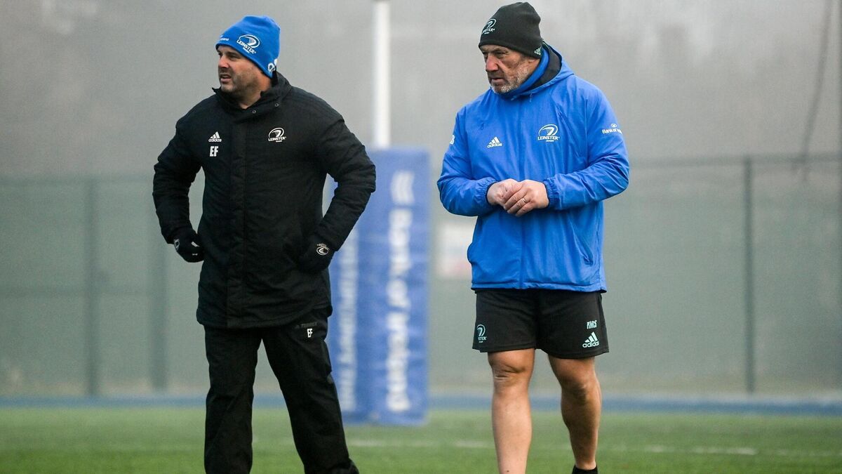 NO APPROACH: Forwards and scrum coach Robin McBryde (right) and Kicking coach and lead performance analyst Emmet Farrell during a Leinster Rugby squad training session at Energia Park in Dublin. Pic: Harry Murphy/Sportsfile