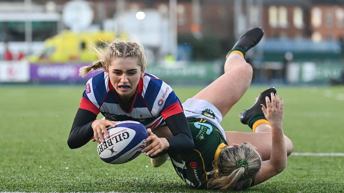 GO FORWARD: Anna Doyle of Blackrock College scores her side's fourth try, despite the tackle of Railway Union's Stephanie Carroll. Picture Seb Daly/Sportsfile