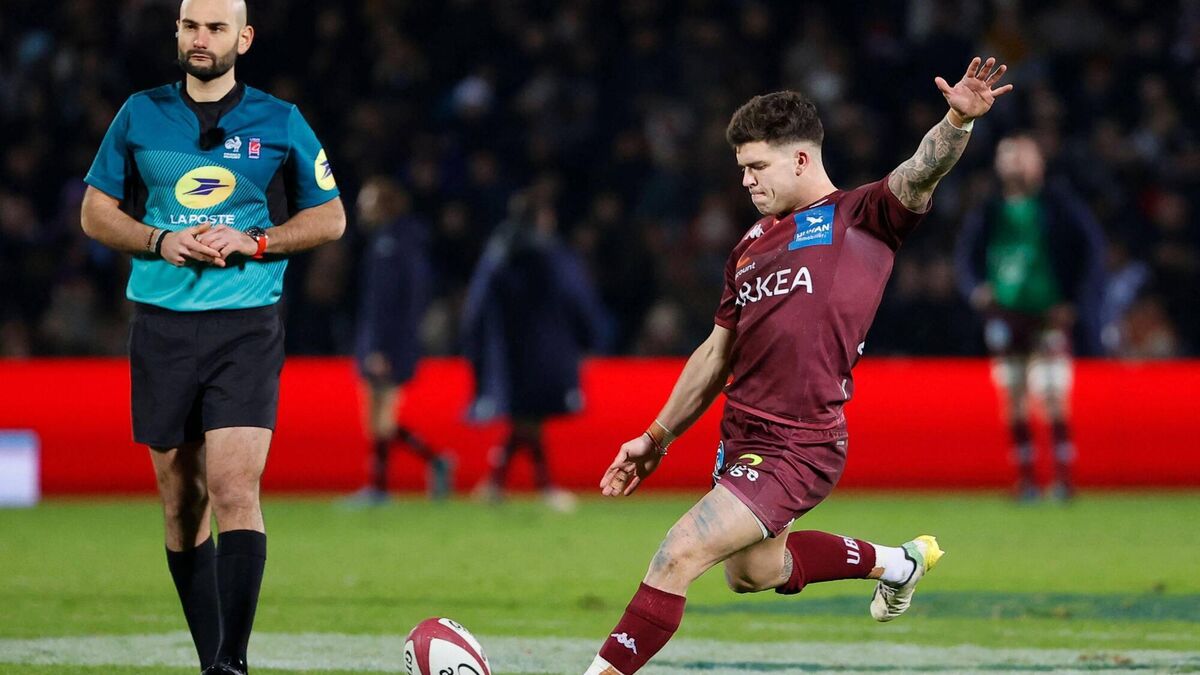 Bordeaux-Begles' French fly-half Matthieu Jalibert kicks a penalty (Photo by ROMAIN PERROCHEAU/AFP via Getty Images)
