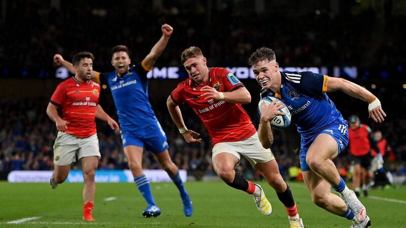 ANOTHER GO: Rob Russell of Leinster runs in to score his side's fourth try during the United Rugby Championship match between Leinster and Munster at Aviva Stadium in Dublin. Pic: Brendan Moran/Sportsfile