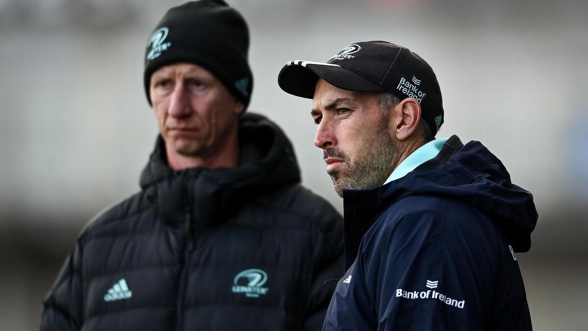 WATCHFUL EYE: Leinster backs coach Andrew Goodman, right, and head coach Leo Cullen during squad training at Energia Park in Dublin. Pic: David Fitzgerald/Sportsfile