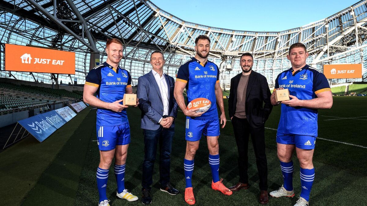 LAUNCH: Leinster players, Ciaran Frawley, Eamon de Búrca, Sponsorship Manager at Leinster Rugby, Jason Jenkins, John Carey, Head of Marketing at Just Eat Ireland and Tadhg Furlong at the Aviva Stadium on Friday. Picture: INPHO/Dan Sheridan