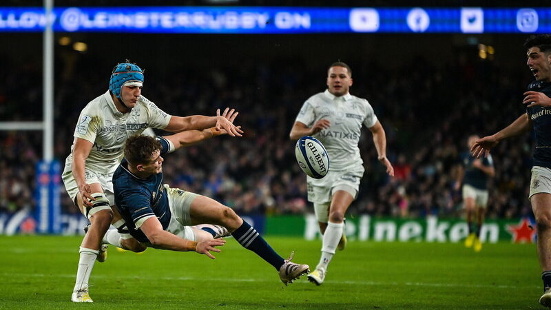 OFFLOAD: Garry Ringrose of Leinster passes to team-mate Jimmy O'Brien, right, despite the attention of Maxime Baudonne of Racing 92, during the Heineken Champions Cup Pool A Round 4 match between Leinster and Racing 92 at Aviva Stadium in Dublin. Pic: Brendan Moran/Sportsfile