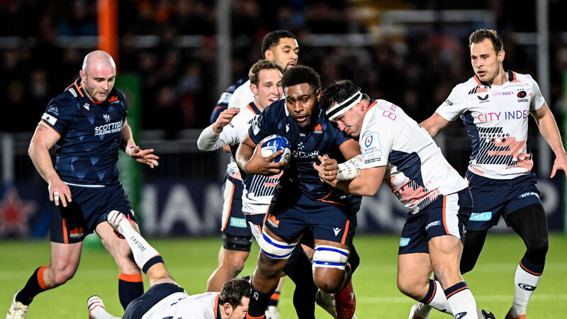 Edinburgh’s Viliame Mata is tackled by Jamie George of Saracens. Picture: INPHO/Craig Watson