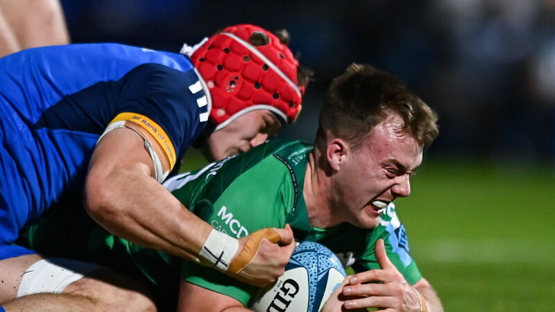 TWO MORE YEARS: David Hawkshaw of Connacht scores his side's first try despite the tackle of Josh van der Flier of Leinster during the United Rugby Championship between Leinster and Connacht at RDS Arena in Dublin. Photo by Ben McShane/Sportsfile