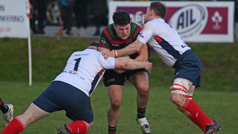 DOUBLE TEAM: Highfield's Robert Murphy is tackled by Malone's Ben Halliday and Neil Alcorn during the Energia AIL Division 1B game at Woodleigh Park. Pic; Eddie O'Hare