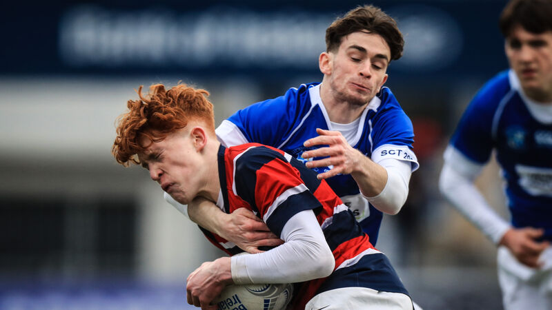 IMPACT: Finn Nolan of Wesley College is tackled by Jack Halpin of St Mary's College. Picture: Evan Treacy/Inpho