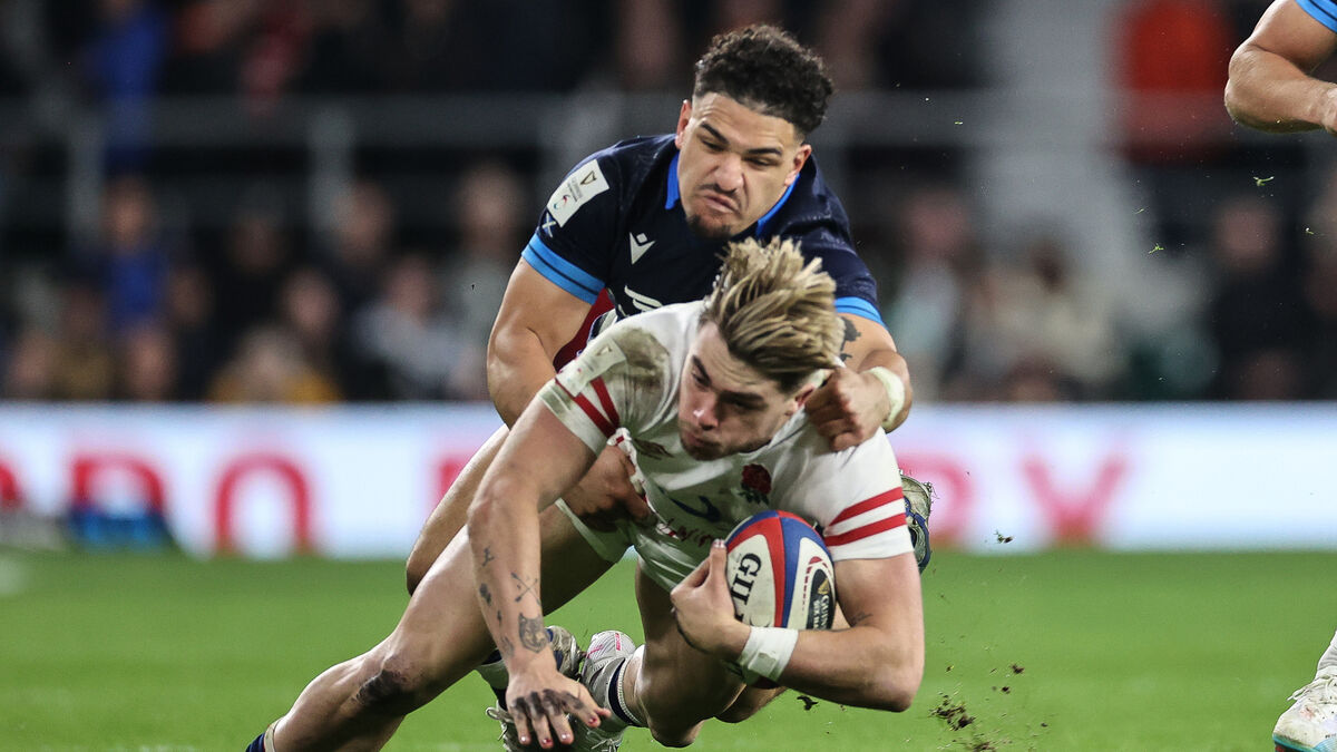 'LOOK GOOD, FEEL GOOD, PLAY GOOD': England’s Ollie Hassell-Collins with Sione Tuipulotu of Scotland. Pic: ©INPHO/Billy Stickland