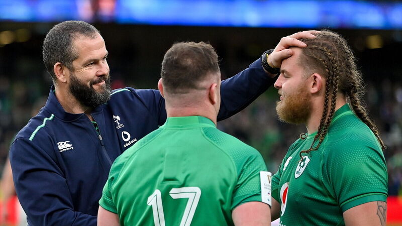 VIKING-STYLE: Ireland head coach Andy Farrell, left, with Dave Kilcoyne and Finlay Bealham, right. Pic: Brendan Moran/Sportsfile