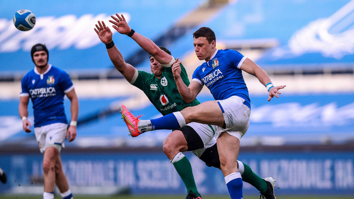 INJURY RETURN: Italy's Paolo Garbisi kicks past CJ Stander of Ireland