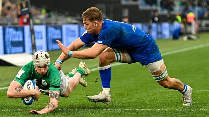 BACK-AND-FORTH BATTLE: Mack Hansen of Ireland dives over to score his side's fourth try during the Guinness Six Nations Rugby Championship match between Italy and Ireland at the Stadio Olimpico in Rome. Pic: Ramsey Cardy/Sportsfile