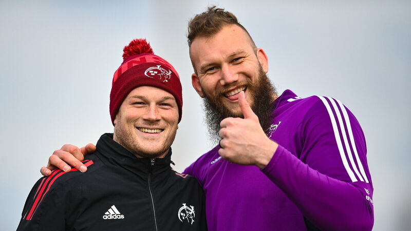 ALL SMILES: RG Snyman, right, and Jack O'Donoghue during a Munster rugby squad training session at the University of Limerick in Limerick. Pic: David Fitzgerald/Sportsfile