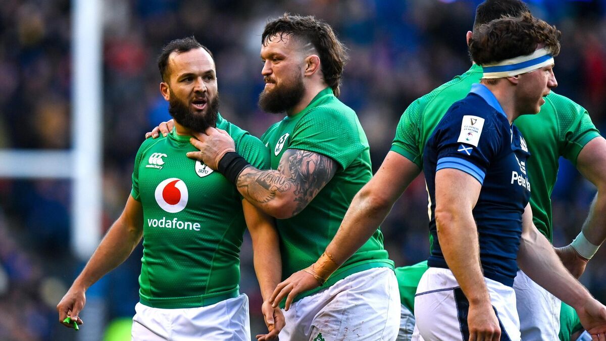 THRIVING IN CHAOS: Jamison Gibson Park, left, and Andrew Porter of Ireland after the Guinness Six Nations Rugby Championship match between Scotland and Ireland at BT Murrayfield Stadium in Edinburgh, Scotland. Photo by Harry Murphy/Sportsfile