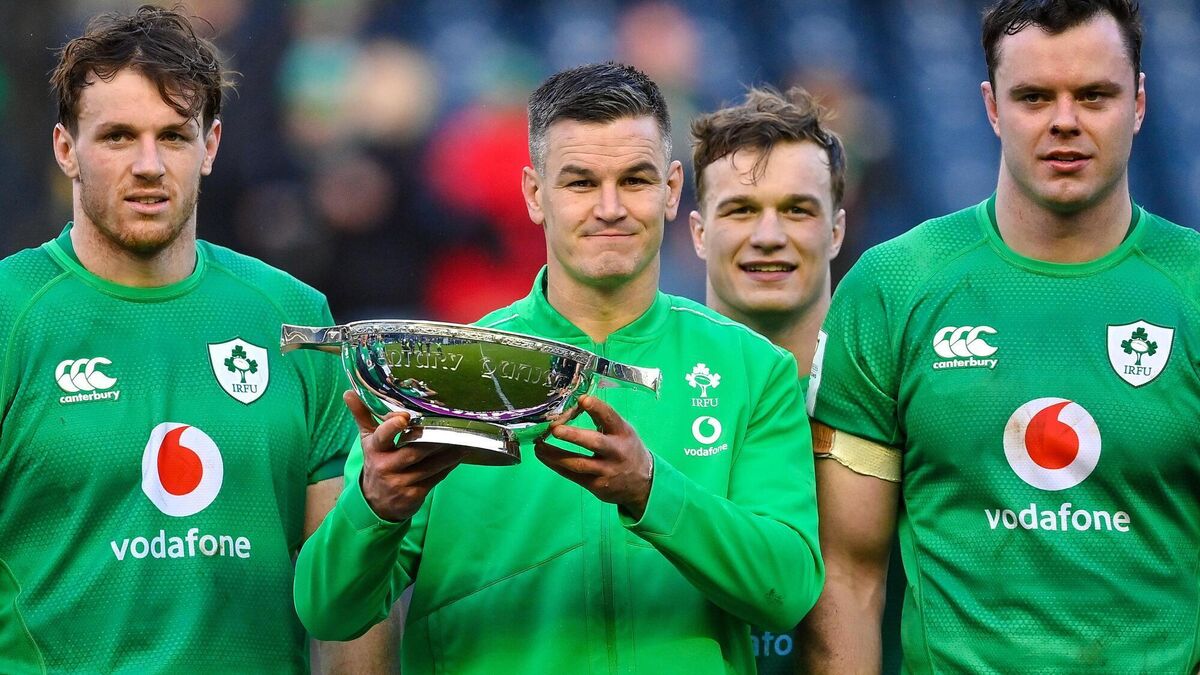 HOYS IN GREEN: Johnny Sexton holds the Centenary Quaich alongside teammates, from left, Ryan Baird, Josh van der Flier and James Ryan after the win over Scotland in Murrayfield