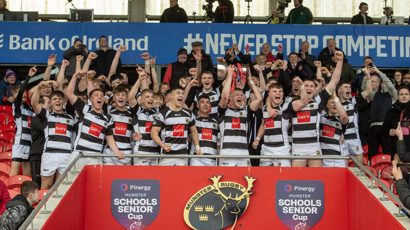 ANOTHER YEAR ON TOP: PBC Captain Rory O'Shaughnessy and his team lift the trophy after their victory over CBC in their Pinergy Munster Schools Senior Cup final at Musgrave Park. Pic: Dan Linehan