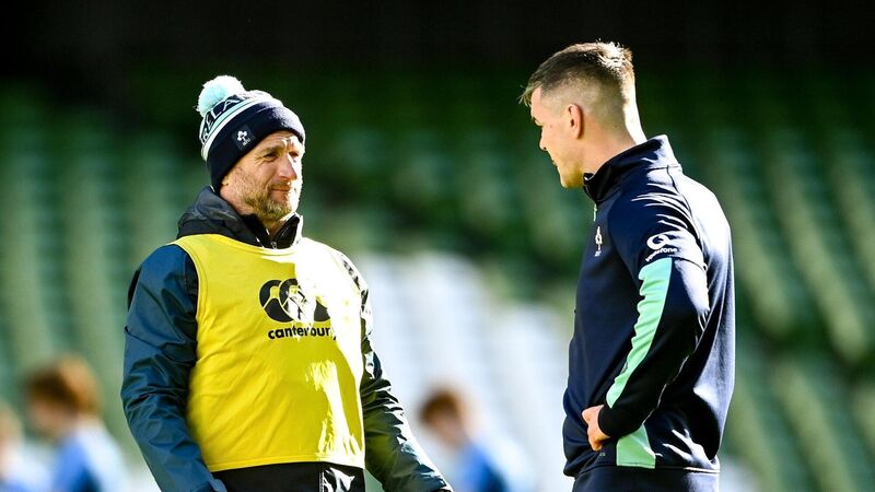 SHARING KNOWLEDGE: Ireland assistant coach Mike Catt and Jonathan Sexton during an Ireland Rugby open training session at the Aviva Stadium in Dublin. Pic: Harry Murphy/Sportsfile