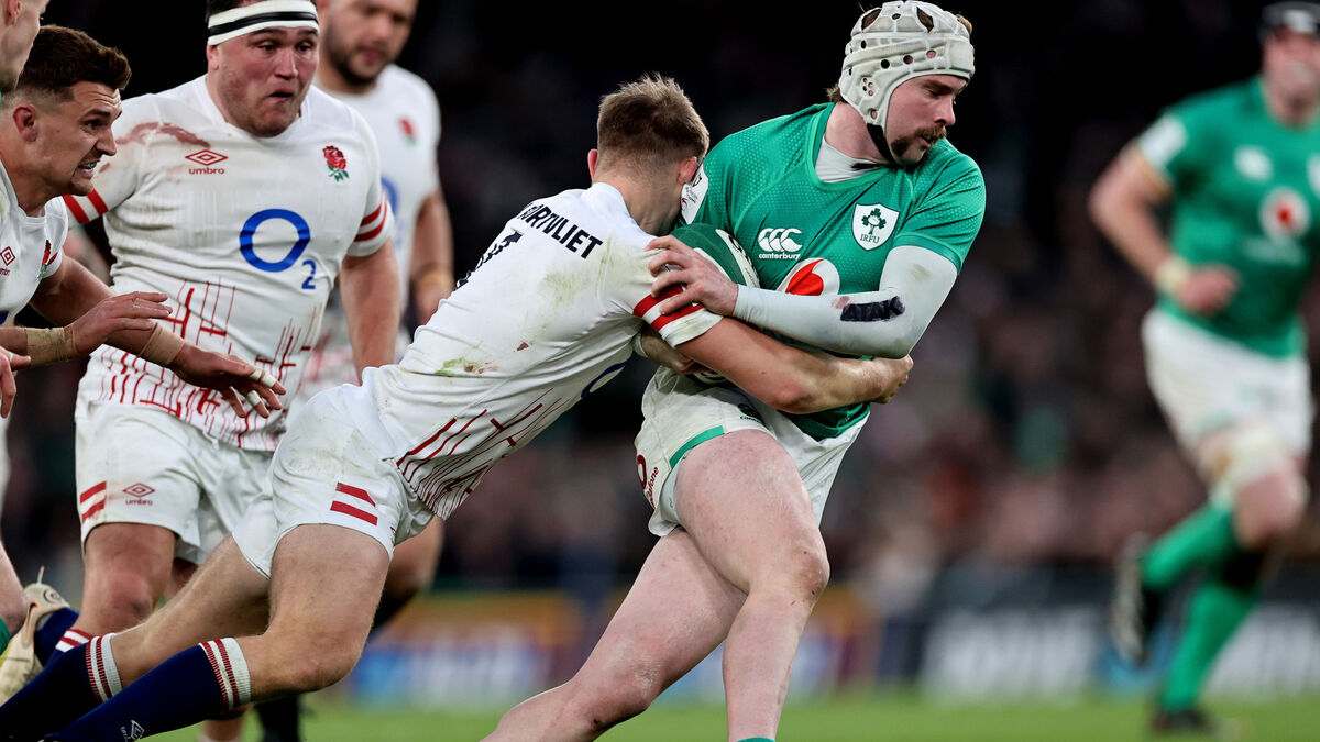 Ireland’s Mack Hansen is tackled by England's Jack van Poortvliet. Picture: INPHO/Billy Stickland