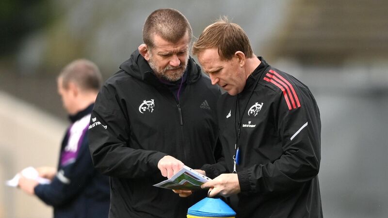 WORK TO DO: Head coach Graham Rowntree and attack coach Mike Prendergast during a Munster Rugby squad training session at Thomond Park last week. Pic: Harry Murphy/Sportsfile