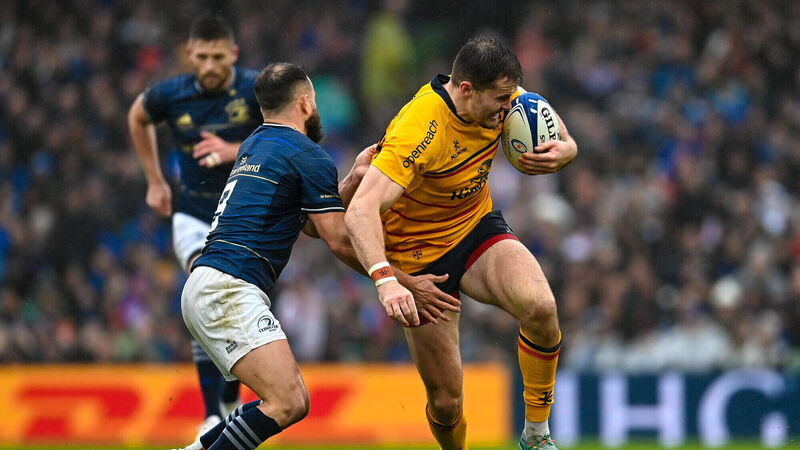 Jacob Stockdale of Ulster is tackled by Jamison Gibson-Park of Leinster during the Heineken Champions Cup Round of 16 match last week. Picture: Ramsey Cardy/Sportsfile