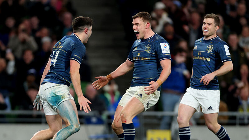 BLUE ARMY: Leinster’s Jimmy O’Brien celebrates scoring his sides seventh try with Luke McGrath and Garry Ringrose. Pic: ©INPHO/James Crombie