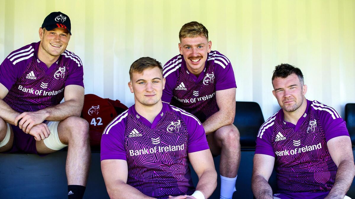FUN IN THE SUN: Jack O'Donoghue, Gavin Coombes, Ben Healy, and Peter O'Mahony during a Munster training session in South Africa. Pic: INPHO/Steve Haag Sports/EJ Langner