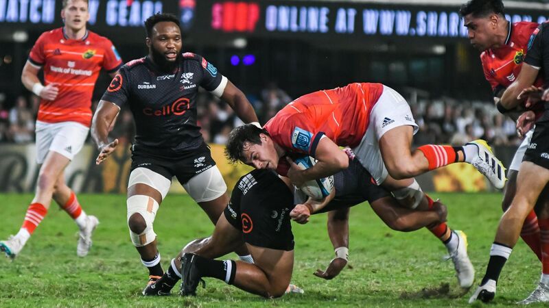 GOING LOW: Antoine Frisch of Munster is tackled during the United Rugby Championship match against Cell C Sharks at Hollywoodbets Kings Park Stadium in Durban, South Africa. Pic: Darren Stewart/Sportsfile