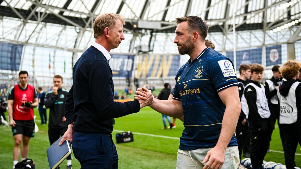JUST THE JOB: Leinster head coach Leo Cullen shakes hands with Jack Conan after the Heineken Champions Cup Semi-Final match between Leinster and Toulouse at the Aviva Stadium in Dublin. Pic: Harry Murphy/Sportsfile