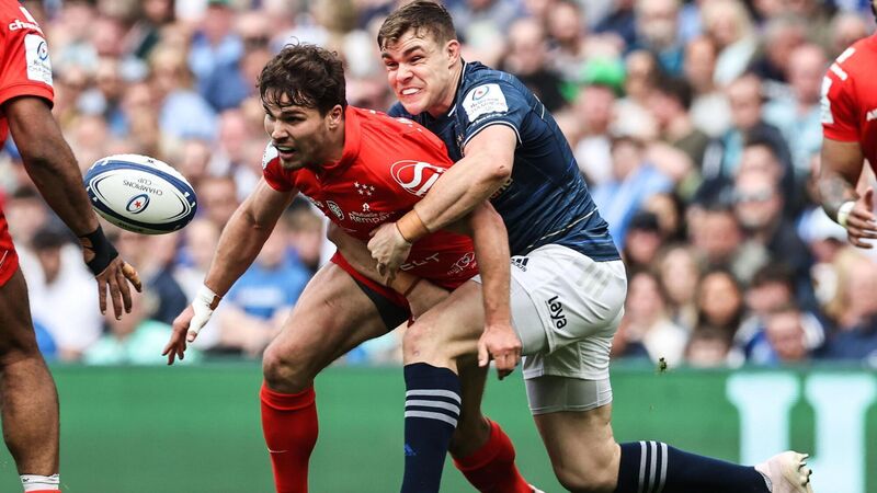 UP FOR GRABS: Toulouse’s Antoine Dupont is tackled by Gary Ringrose of Leinster. Pic: INPHO/Billy Stickland