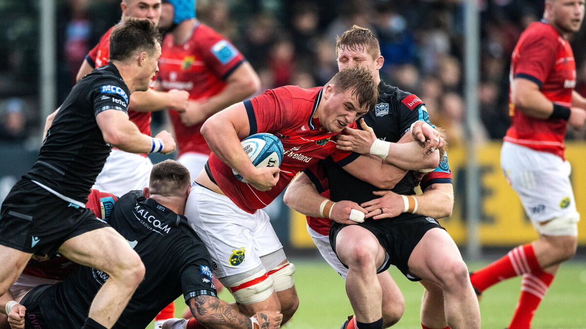 COLOSSUS: Gavin Coombes of Munster is tackled by Johnny Matthews of Glasgow Warriors during the United Rugby Championship Quarter-Final match between Glasgow Warriors and Munster at Scotstoun Stadium in Glasgow, Scotland. Pic: Paul Devlin/Sportsfile