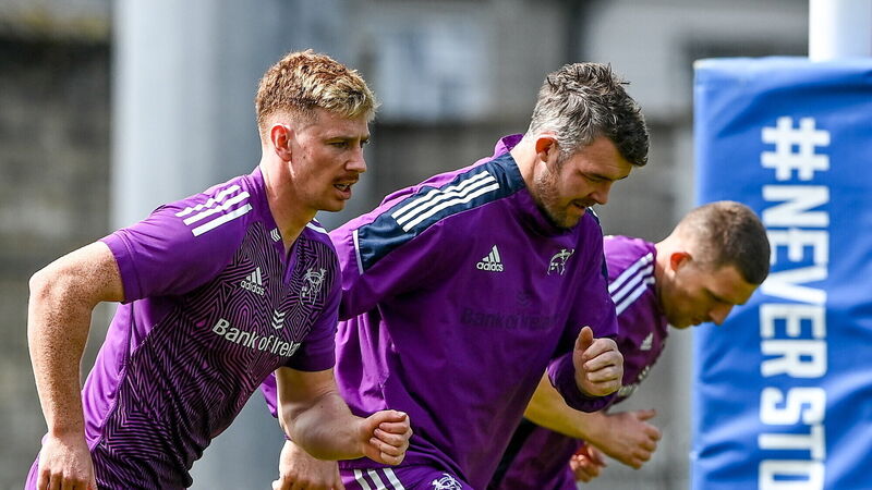 GEARING UP: Munster players, from left, Ben Healy, Peter O'Mahony and Andrew Conway during a Munster Rugby squad training session at Thomond Park in Limerick. Pic: Harry Murphy/Sportsfile