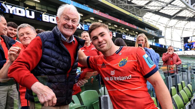 JACK THE LAD: Munster’s Jack Crowley celebrates after the game with his grandfather Billy