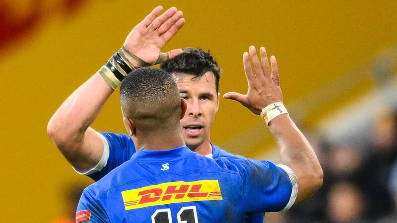 HIGH FIVE: Stormer’s Ruhan Nel and Leolin Zas celebrate after the Connacht game. Pic: INPHO/Steve Haag Sports/Thinus Maritz