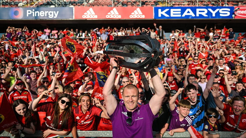 ONE MORE YEAR? Keith Earls celebrates with the trophy during the Munster Rugby homecoming as URC Champions at Thomond Park in Limerick. Pic: David Fitzgerald/Sportsfile