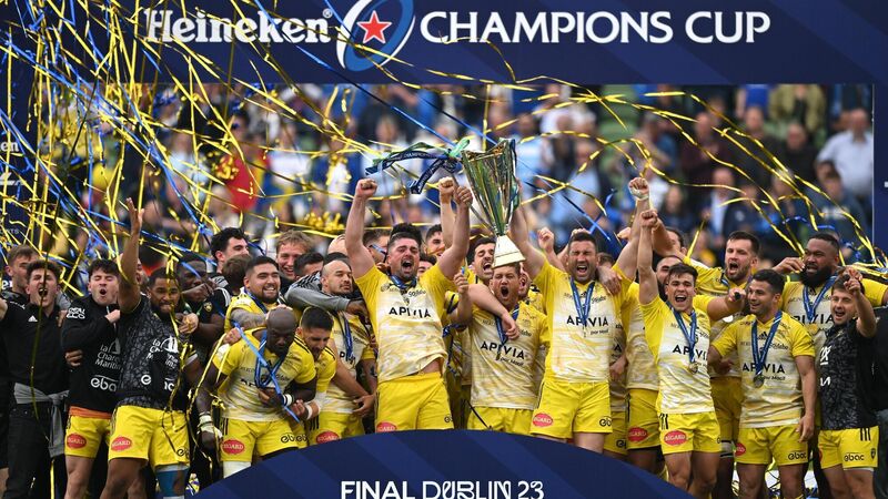 REIGNING CHAMPS: The La Rochelle team celebrate after lifting the Champions Cup in May. Pic: Brendan Moran/Sportsfile