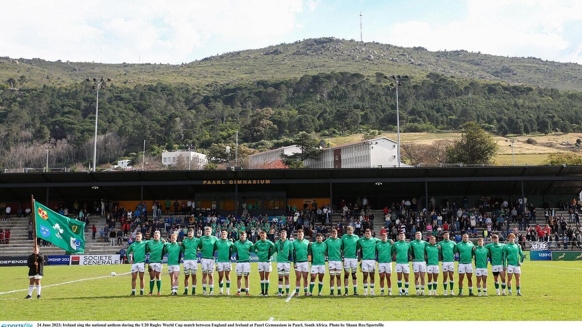 SHOULDER TO SHOULDER: Ireland sing the national anthem before the U20 Rugby World Cup match against England. Photo by Shaun Roy/Sportsfile