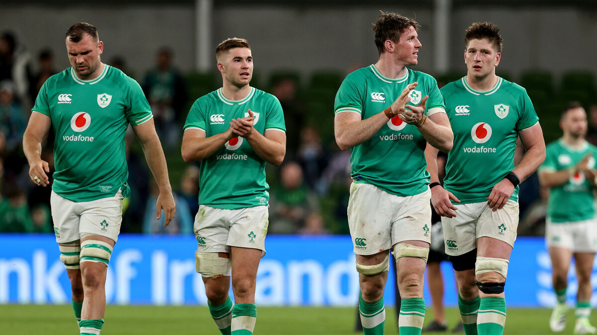 JOB DONE: Ireland's Tadhg Beirne, Jack Crowley, Ryan Baird and Joe McCarthy celebrate after the game. Pic: ©INPHO/Ben Brady