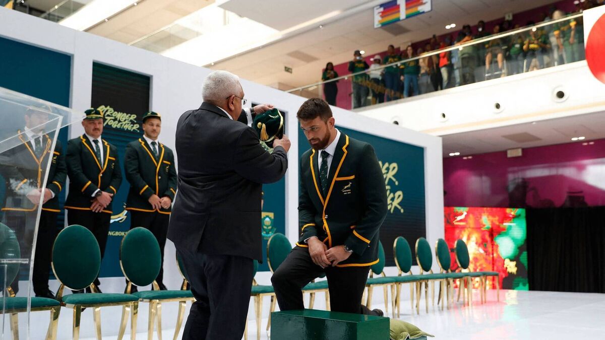 South Africa's lock Jean Kleyn (C) receives a cap from Mark Alexander (C-L), South African Rugby Union (SARU) president, (C-L) during the South Africa Rugby World Cup squad announcement in Johannesburg on August 8, 2023. Pic: PHILL MAGAKOE/AFP via Getty Images