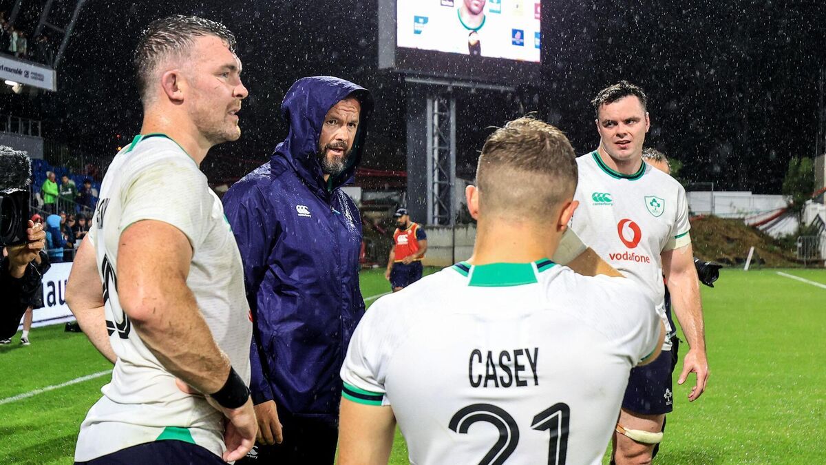 Ireland head coach Andy Farrell speaks with Peter O’Mahony, Craig Casey and James Ryan after the game