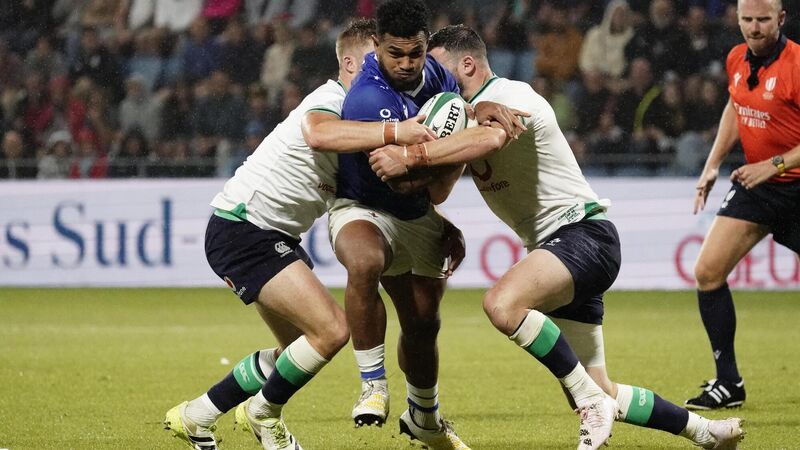 TOUGH TEST: Tumua Manu of Samoa tackled by two Irish players. Pic Credit ©INPHO/Dave Winter