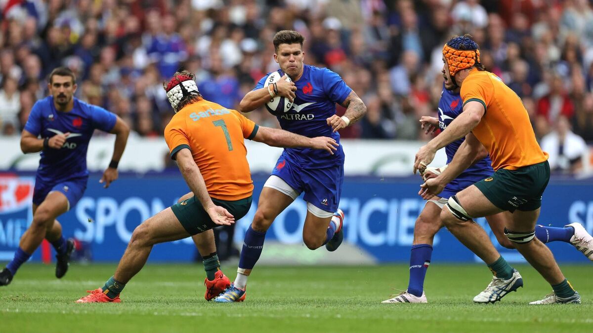 PARIS, FRANCE - AUGUST 27: Matthieu Jalibert of France is tackled by Fraser McReight (L) during the 2023 Summer International match between France and Australia at Stade de France on August 27, 2023 in Paris, France. (Photo by David Rogers/Getty Images)