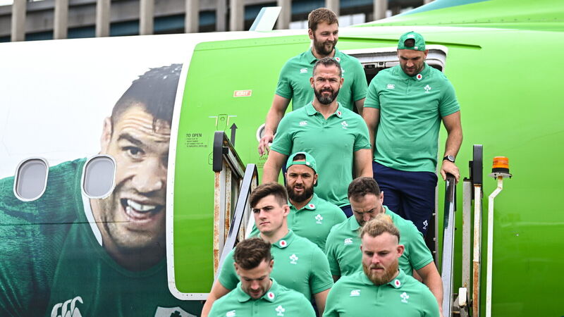 FIRST STEP: Head coach Andy Farrell, third top, and his players pictured at Dublin Airport ahead of Ireland's Aer Lingus flight to France for the 2023 Rugby World Cup. Photo by Harry Murphy/Sportsfile