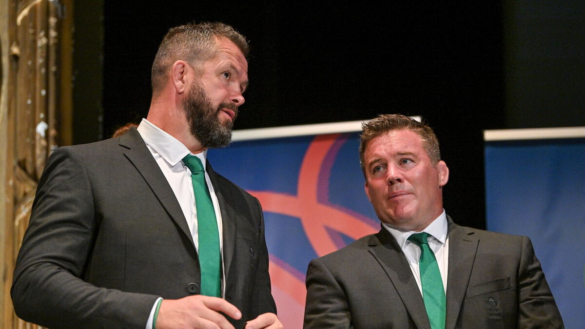 HIT THE GROUND RUNNING: Head coach Andy Farrell, left, and national scrum coach John Fogarty during the Ireland Rugby World Cup 2023 welcome ceremony at Le Grand Théâtre de Tours in France. Pic: Brendan Moran/Sportsfile
