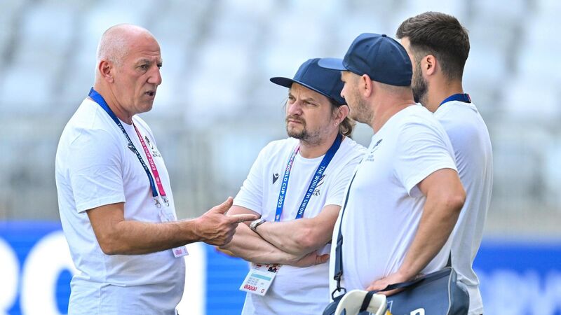 BRAINS TRUST: Head coach Eugen Apjok, left, with his management team during the Romania rugby squad captain's run at the Stade de Bordeaux. Pic: Brendan Moran/Sportsfile