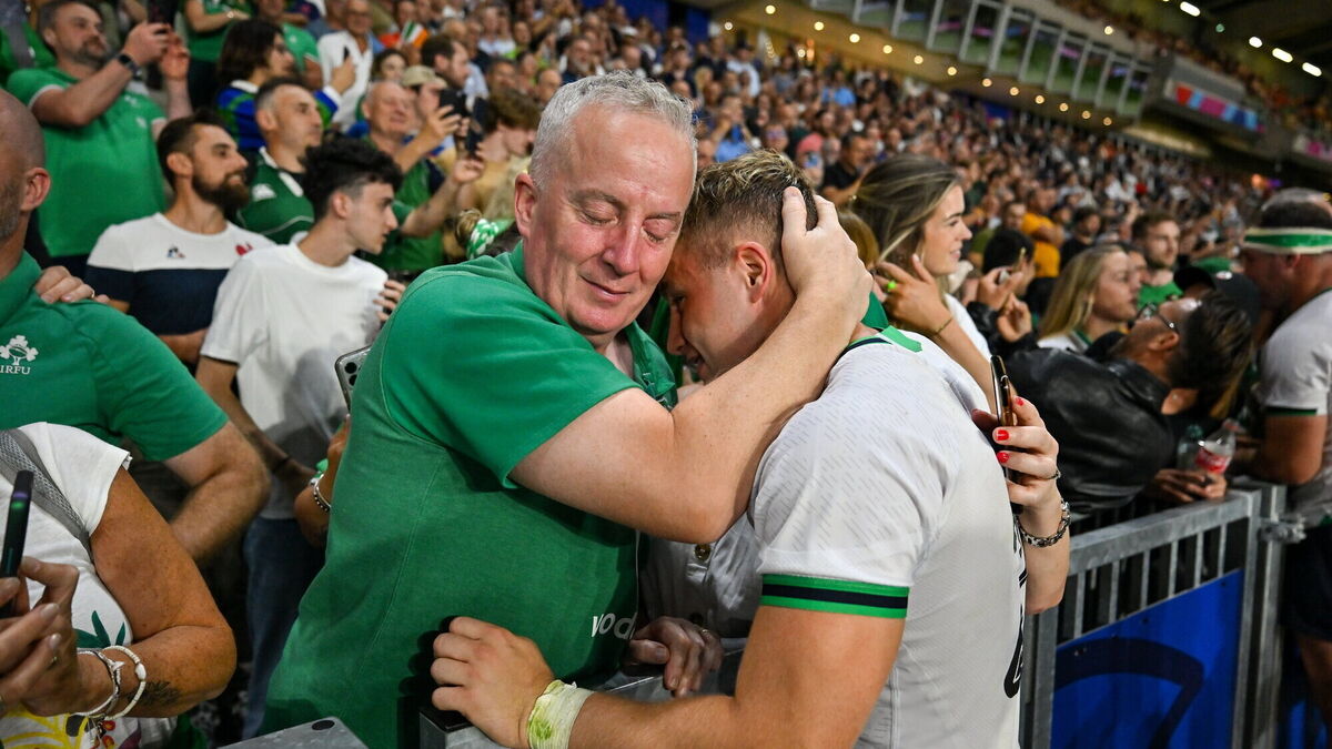 Craig Casey of Ireland with his father Ger after his side's victory in the 2023 Rugby World Cup Pool B match between Ireland and Tonga at Stade de la Beaujoire in Nantes, France. Photo by Brendan Moran/Sportsfile