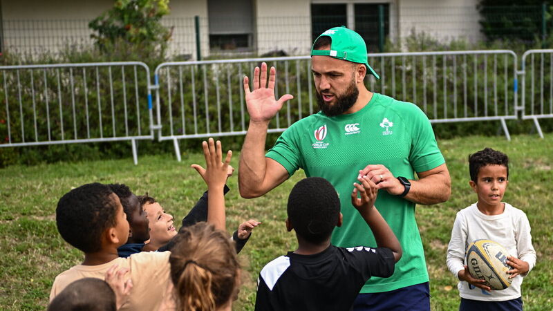 OFF-WEEK: Jamison Gibson-Park with children during an Ireland rugby visit to Drop Quartier Rugby ran by UST Tour Rugby. Pic: Harry Murphy/Sportsfile