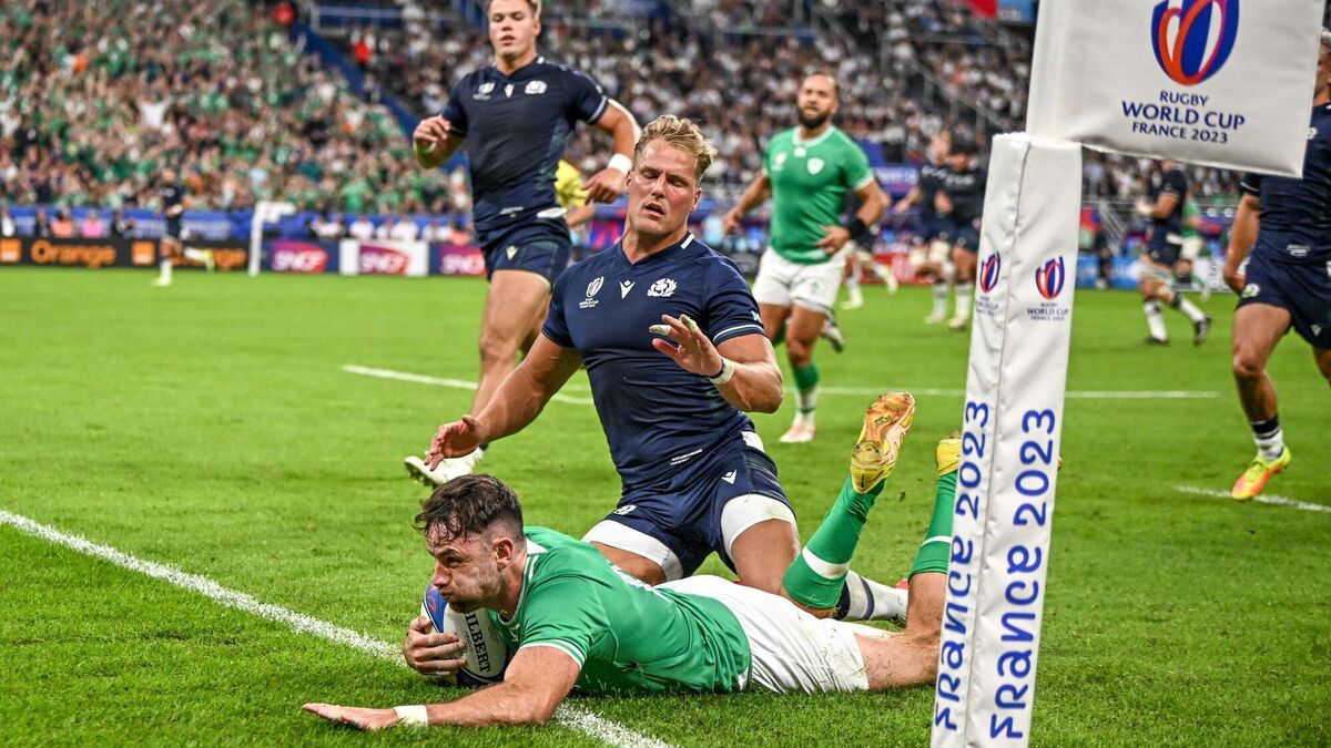 DOTTING DOWN: Hugo Keenan of Ireland dives over to score his side's second try during the victory over Scotland at the Stade de France. Pic: Harry Murphy/Sportsfile